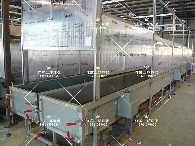 車間地面澆筑防酸水泥,表面做好環氧或者采用耐酸瓷磚鋪設。水槽基礎采用水泥澆筑,外表采用4布5膠環氧玻璃鋼防腐,水槽基礎高于地面25厘米左右,是為了一旦有酸液外流,可以快速的流到地面,而不會影響水槽基礎。水槽基礎的兩頭設有水溝,且地面做有水法,一頭高一頭低,輕微的坡度,這樣做的目的是為了流到地面的酸液能快速的排入污水溝中,同時方便地面沖洗快速集水,盡量保持地面干燥整潔,保護地面的使用壽命。水槽采用PP塑料板焊接而成,槽內裝置有冷卻循環水進水口,當電池極板浸泡酸液時,產生的酸霧有槽體上部的吸罩匯總收集,然后通過管道,由引風機抽出到室外的酸霧凈化塔進行酸堿中和化學反應,中性的氣體經過填料凈化后排入大氣。污水需要定期排放,排入到工廠的污水處理系統集中處理。