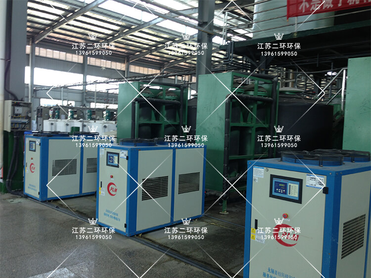 利用風冷式冷凍機或螺桿水冷機冷凍制冷,冷凍機自身帶有高效熱交換器,冷凍壓縮機制冷傳導給冷凍劑R22(乙二醇),溫度保持在-10攝氏度以上,形成冷凍水,存儲在冷凍水箱中。冷凍水與常溫稀硫酸,通過耐腐石墨管熱交換器進行熱量交換,石墨管內壁走流動的稀硫酸,石墨管外壁走流動的冷凍水。兩種液體存在較大的溫差梯度,常溫稀硫酸的熱量快速被石墨管外壁的低溫冷凍水帶走,從而使得稀硫酸能夠快速的被冷卻。整個過程在密閉的容器中進行,沒有酸霧飄逸,安全可靠。